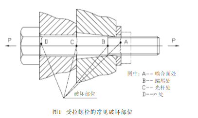 螺栓連接在交變載荷作用下,受拉螺栓的常見破壞部位如圖1。受剪螺栓伴隨有附加彎曲的受載情況,破壞部位和受拉螺栓的破壞部位相似,有時還可能在剪切分離面處破壞。